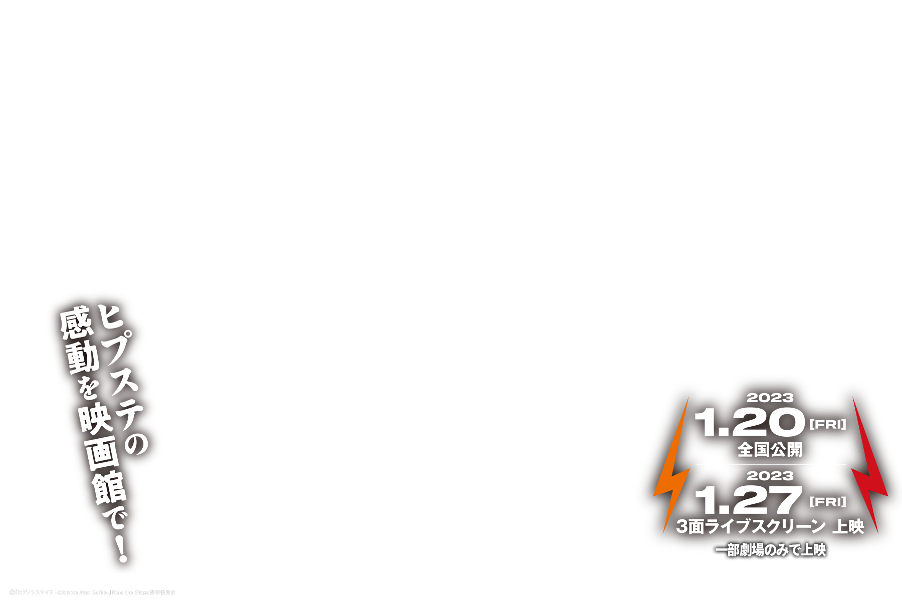 3面ライブスクリーン版の本作では、各キャラクターの細かな演技を余すことなく見られるここだけの特別版として再編集し、7.1chという大迫力の音響とともに提供いたします。ヒプステの新たな魅力を是非「3面ライブスクリーン」でご体感ください!